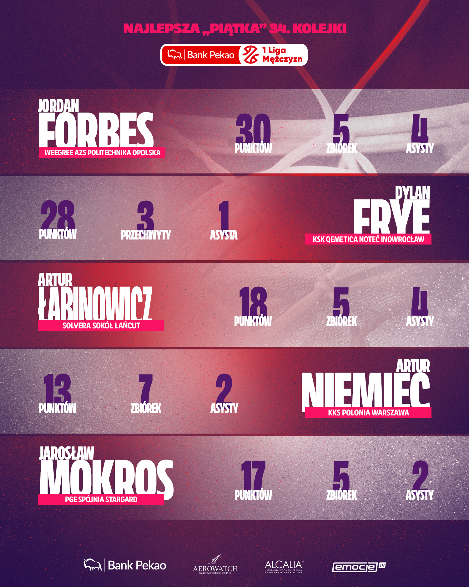 - zgodnie z zasadami gry w Pekao 1 Lidze Mężczyzn, w piątce kolejki znaleźć się może maksymalnie dwóch zawodników zagranicznych