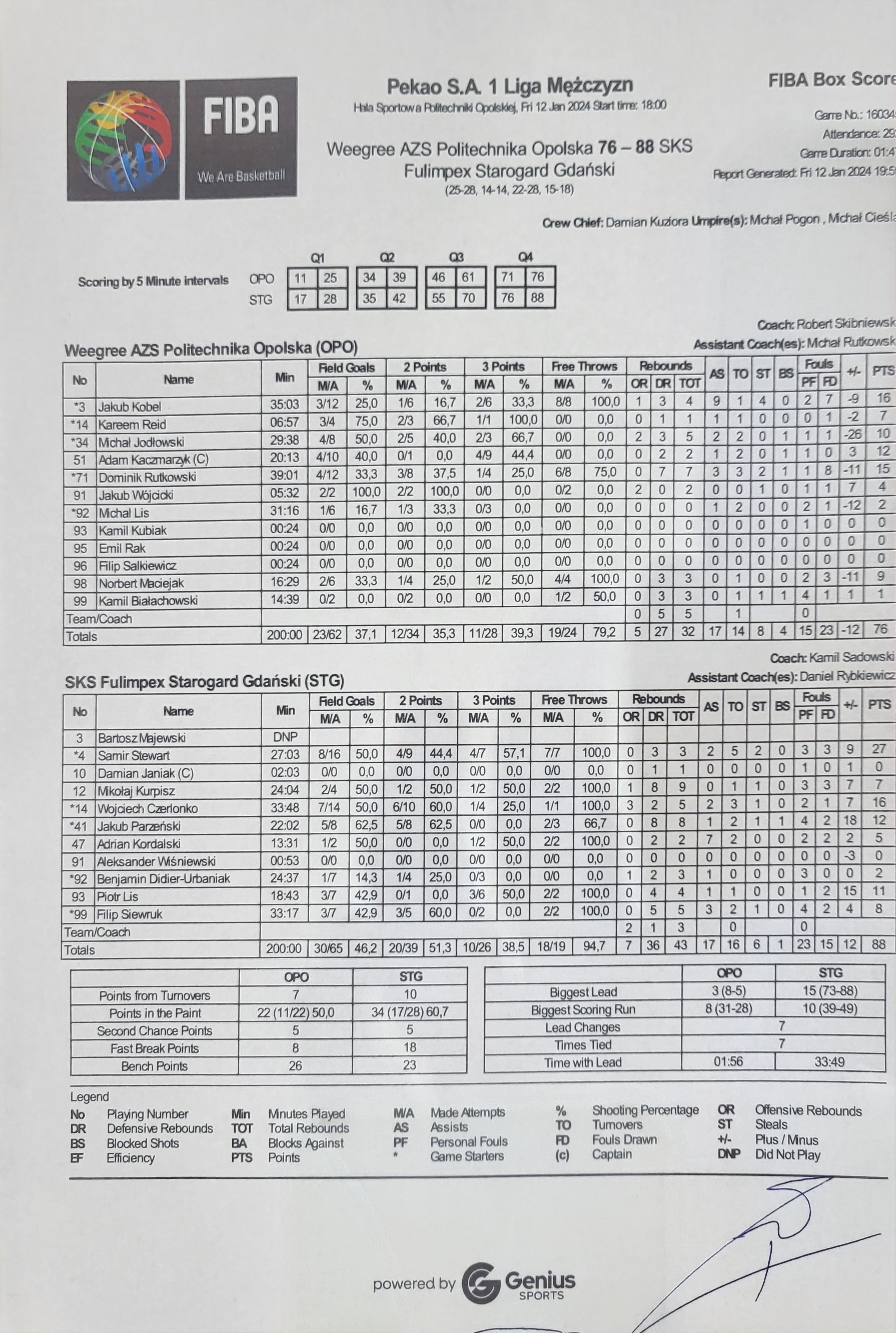 | 34 | Michał Jodłowski | 10 | 29:38 | 2/5 | 40.0 | 2/3 | 66.7 | 4/8 | 50.0 |   |   | 2 | 3 | 5 | 2 | 1 | 1 | 2 |   | 1 |   | 12 | -26 | |