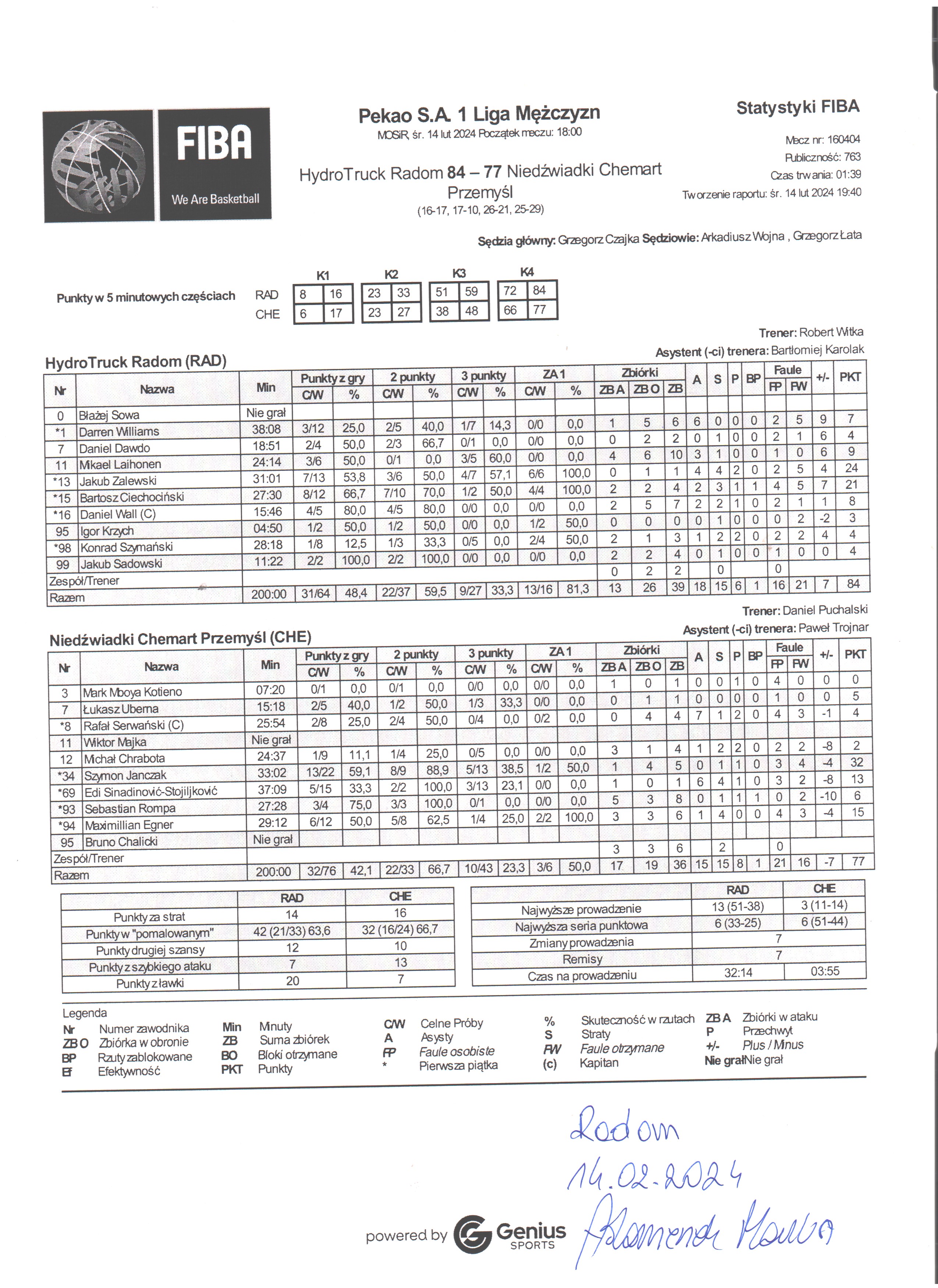 | 98 | Konrad Szymański | 4 | 28:18 | 1/3 | 33.3 | 0/5 | 0.0 | 1/8 | 12.5 | 2/4 | 50.0 | 2 | 1 | 3 | 1 | 2 | 2 | 2 | 2 |   |   | -1 | 4 | |