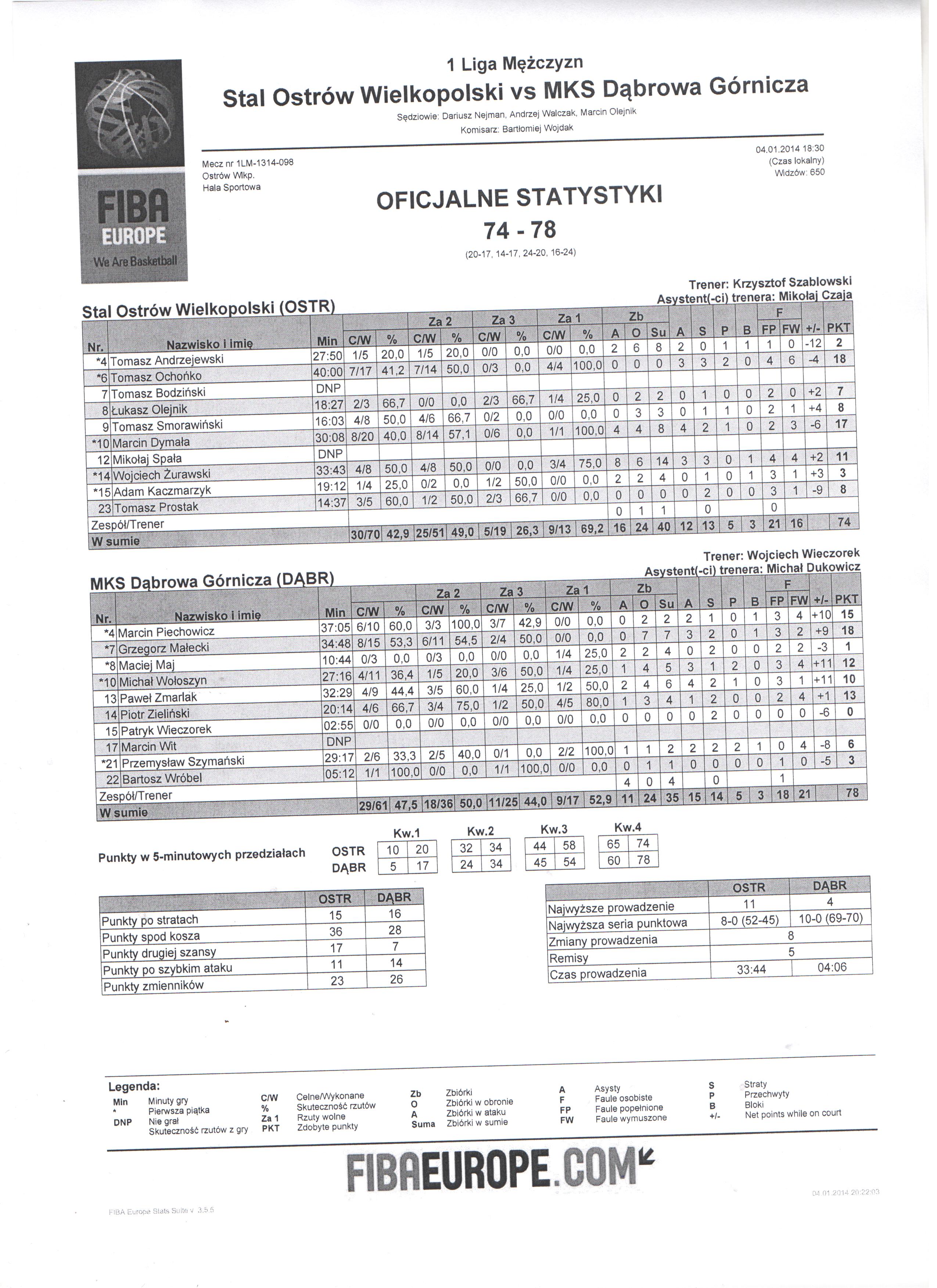 M. Dymała - faul osobisty w akcji rzutowej (2 F, 9 Faul zespołu). Przyznano 2 rzuty wolne. Faulowany: P. Zieliński |