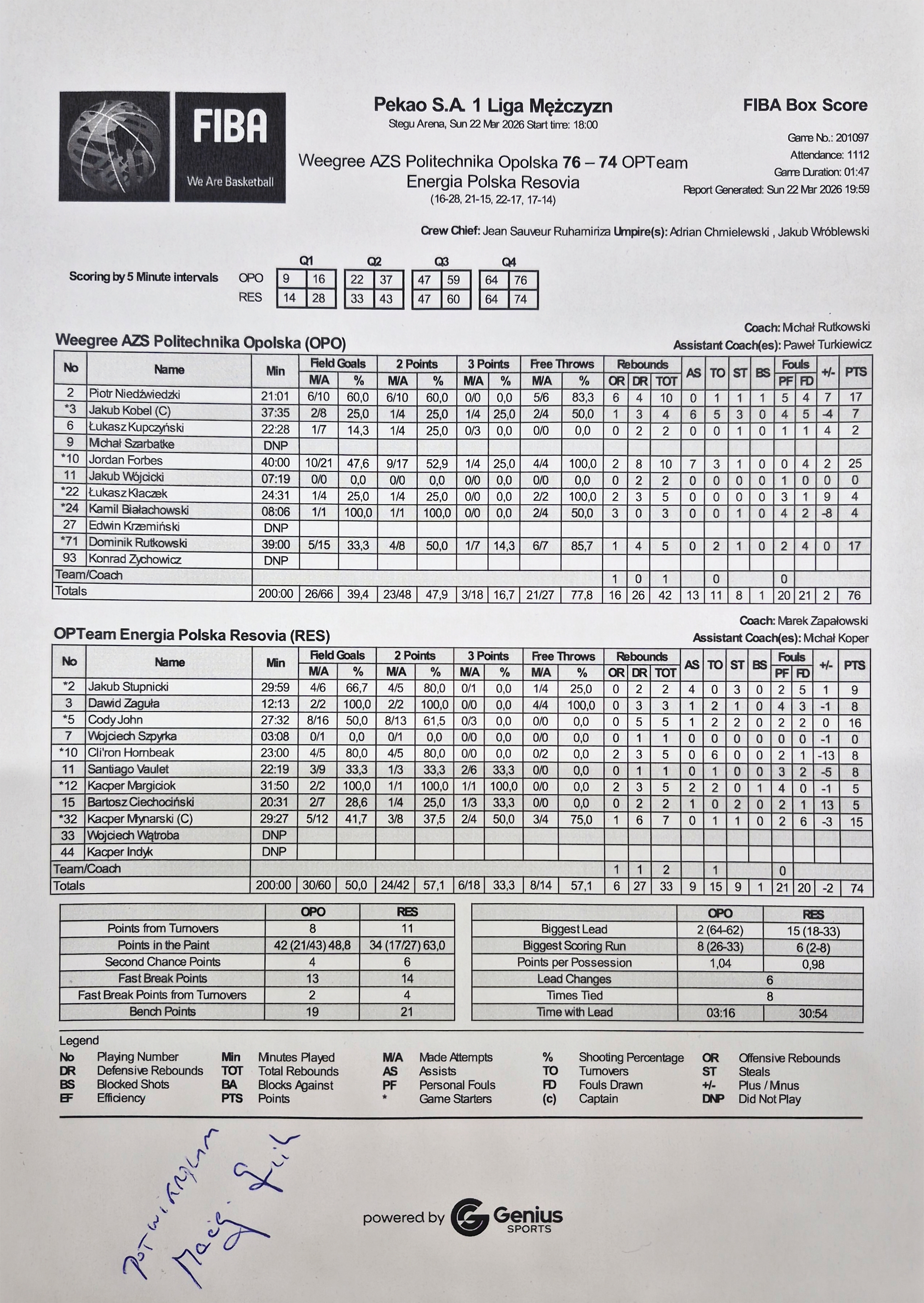 | 2 | Piotr Niedźwiedzki | 17 | 21:01 | 6/10 | 60.0 |   |   | 6/10 | 60.0 | 5/6 | 83.3 | 6 | 4 | 10 |   | 5 | 4 | 1 | 1 | 1 |   | 23 | 7 | |