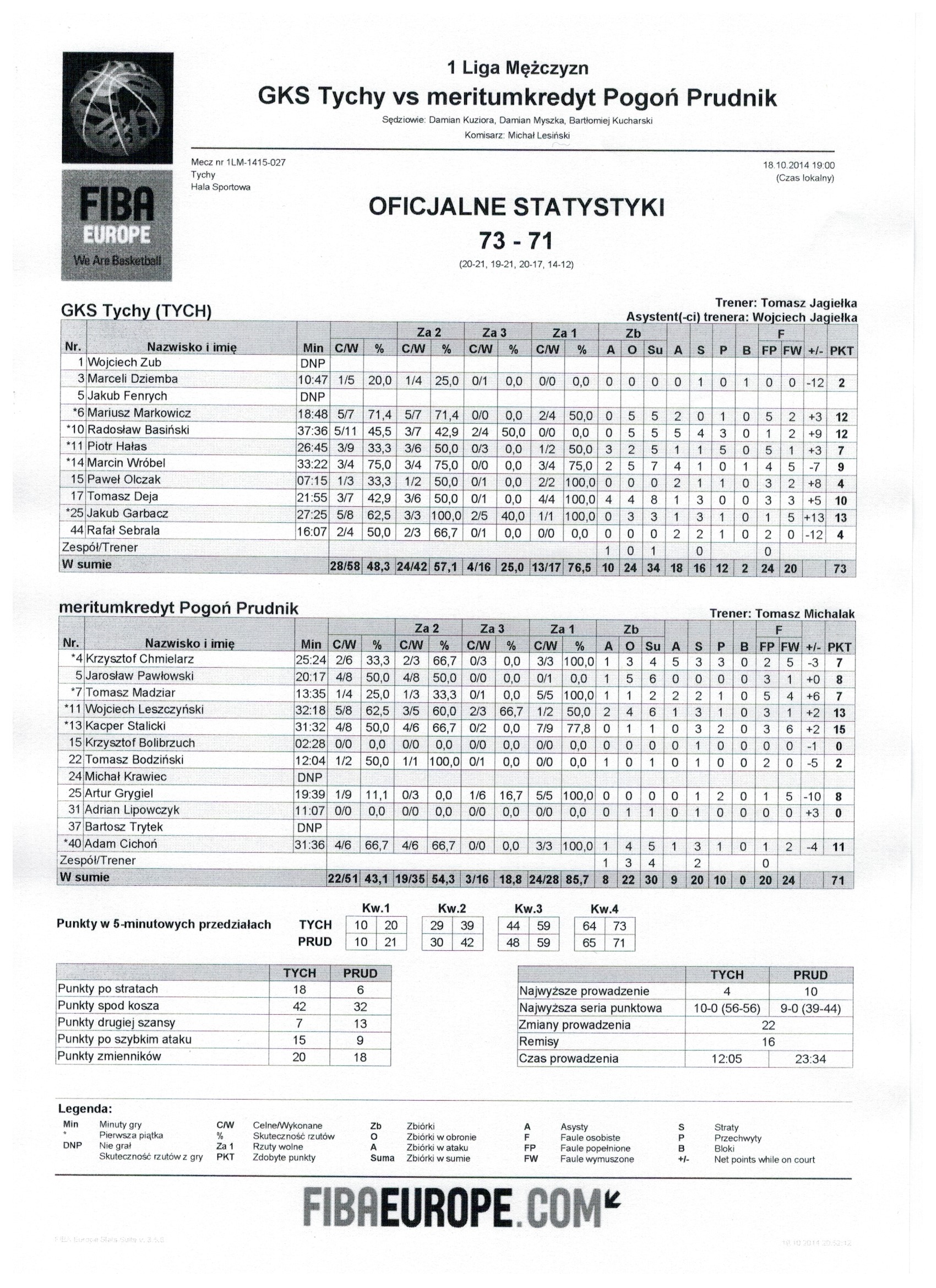 | 7 | Tomasz Madziar | 7 | 13:35 | 1/3 | 33.3 | 0/1 | 0.0 | 1/4 | 25.0 | 5/5 | 100.0 | 1 | 1 | 2 | 2 | 5 | 4 | 2 | 1 |   |   | 7 | 6 | |